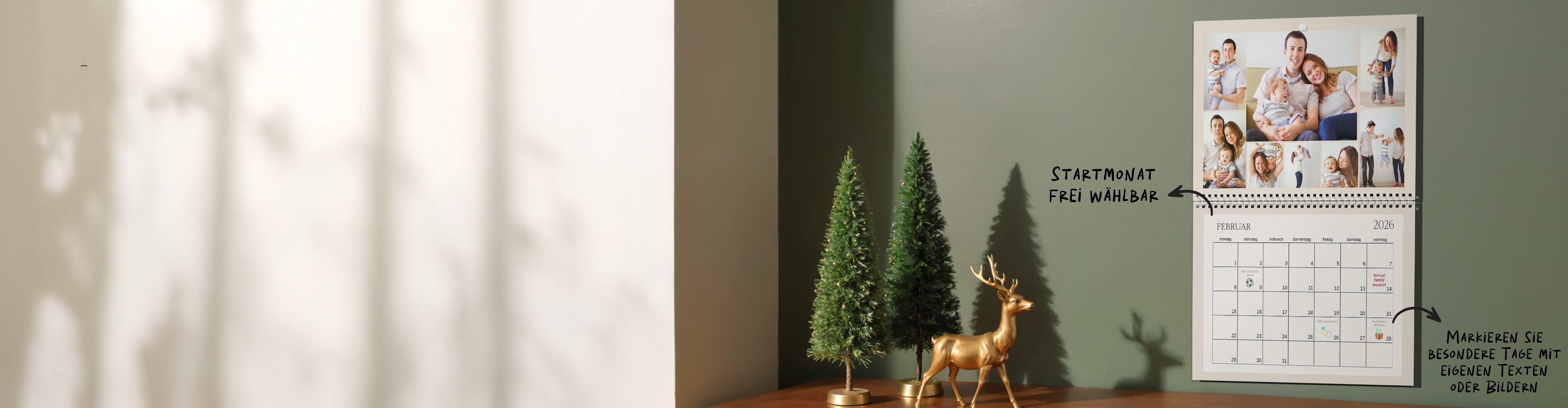 Ob klassischer Wandkalender oder Terminplaner für den Schreibtisch, dank unserer Design-Tools und budgetfreundlichen Preisgestaltung designen Sie Fotokalender für 2026, die Ihnen (und Ihrem Portemonnaie) das ganze Jahr lang Freude bereiten. Personalisieren Sie Ihre Fotokalender durch die gezielte Wahl von Farben und Designelementen. Einige unserer Kalendermodelle bieten Raum für besondere Termine wie Geburtstage oder Unternehmensevents. Wie wär’s mit einer neuen Tradition? Läuten Sie ab sofort jedes neue Jahr mit einem vollfarbig gedruckten Kalender auf hochwertigem Papier für Familie oder Angestellte ein.