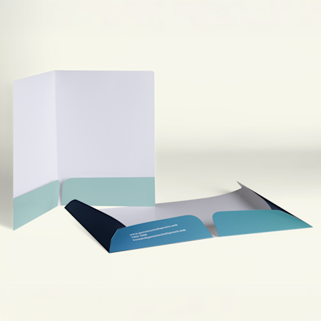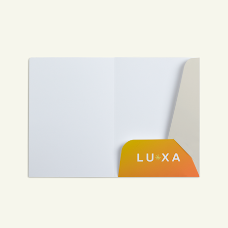 Bei uns finden Sie zwei Mappengrößen – eine für DIN-A4-Seiten, die in DIN-C4-Umschläge passt, und eine kleinere Größe für DIN-A5-Seiten mit Kompatibilität mit DIN-C5-Umschlägen. Sie können dabei zwischen individuellen Präsentationsmappen mit zwei Taschen oder mit einer Tasche wählen, wobei die Taschen wahlweise als kostengünstige Version von Ihnen gefaltet werden oder in der Premium-Ausführung bereits geklebt geliefert werden. Alle Mappen enthalten einen Visitenkartenschlitz und können mit mattem, hochglänzendem oder Soft-Touch-Papier bestellt werden.