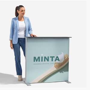 Diese Theke besteht aus einem leichten Aluminiumrahmen, der sich leicht für den Transport falten lässt. Die Rahmenstärke von nur 85 mm sorgt für eine schlanke Optik und wird durch die schwarze Thekenoberfläche, die bis zu 5 kg belastbar ist, auf stylishe Weise ergänzt. Ihre bedruckten Stoffe werden mit SEG-Technik, also mit Textilspannrahmen, befestigt, damit Sie Ihr Branding oder abgelaufene Promos in wenigen Sekunden austauschen können. Die Theke misst 993 x 993 mm und alle bedruckbaren Stoffe bestehen aus schwer entflammbarem Polyester (gemäß Brandschutzklasse B1), weshalb sie sich problemlos und sicher in öffentlichen Innenräumen nutzen lassen.Personalisierung – leicht gemacht